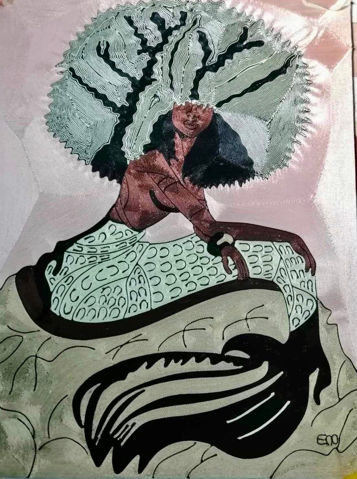 "The Sister Mermaid Trio" is the creation of Silk String Artist Nana Quame Enninful of Ghana, Africa. Enniful specializes in using silk thread to create art using a traditional technique where thread is interwoven and anchored to a card with adhesive. The crisscrossing of the thread results in captivating, three dimensional artwork. "The Sister Mermaid Trio" Silk String on canvas is 26"x 36" framed and comes with two additional matching silk thread pictures that are 16"x20" each of fish swimming next to the mermaid. (Not Shown Here) The minimum donation is $800.00.