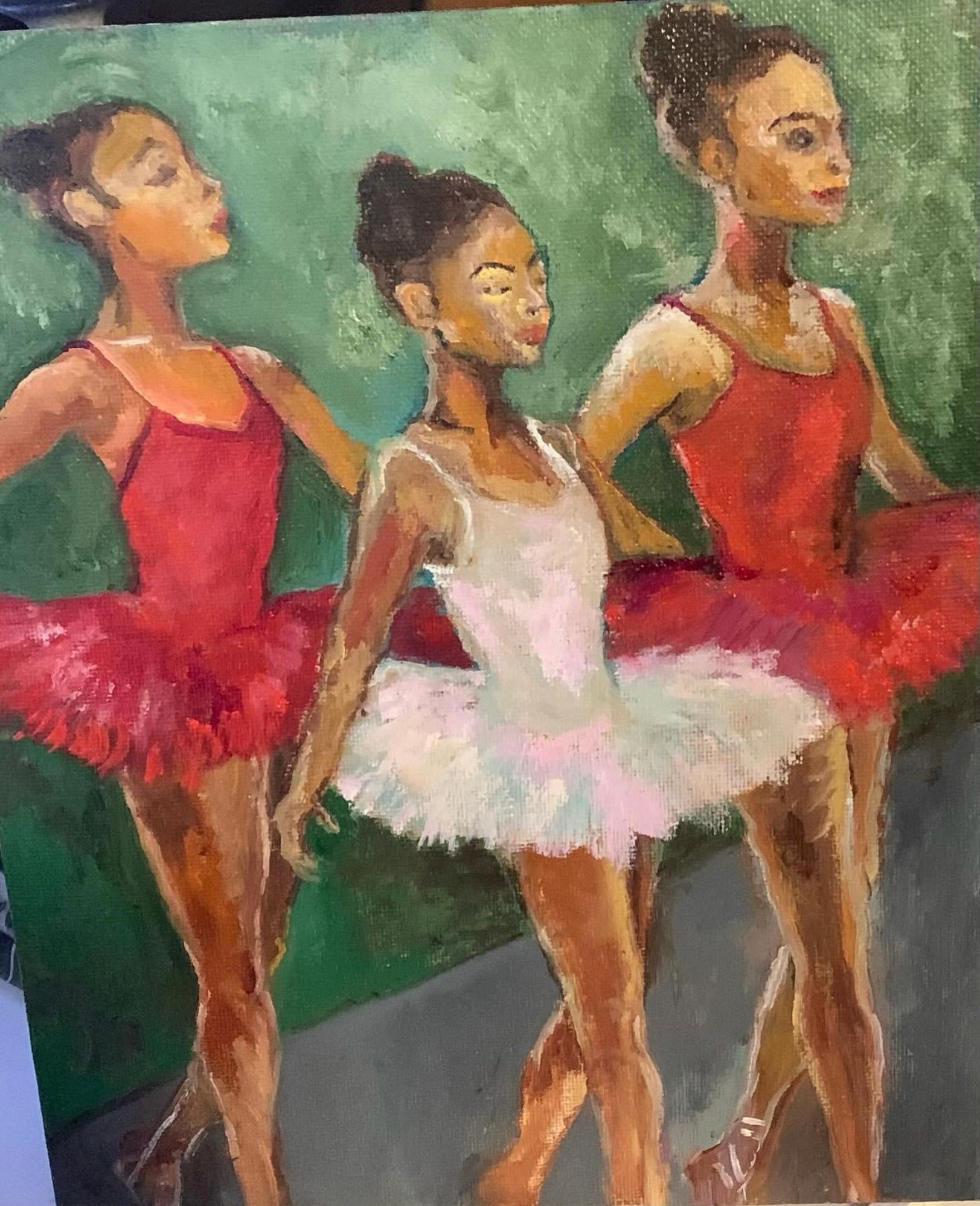 “Three Ballerina’s” is the creation of Jeanine McClain. McClain is an accomplished artist drawing and painting with a primitive effects. This painting is 8"x 10" and framed.