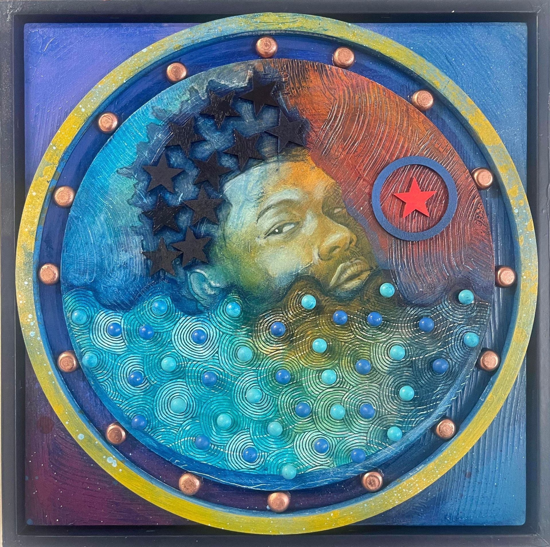"Party Blue", is the creation of mosaic artist Jacques P. Jackson of Cleveland, Ohio. Jackson is the owner of Soul House Decor where he creates home décor pieces, plaques, wearable art, tikis, earrings, lapel pins and bracelets. We celebrate him and his work and are happy to have it here in the Art For Charity Gallery.