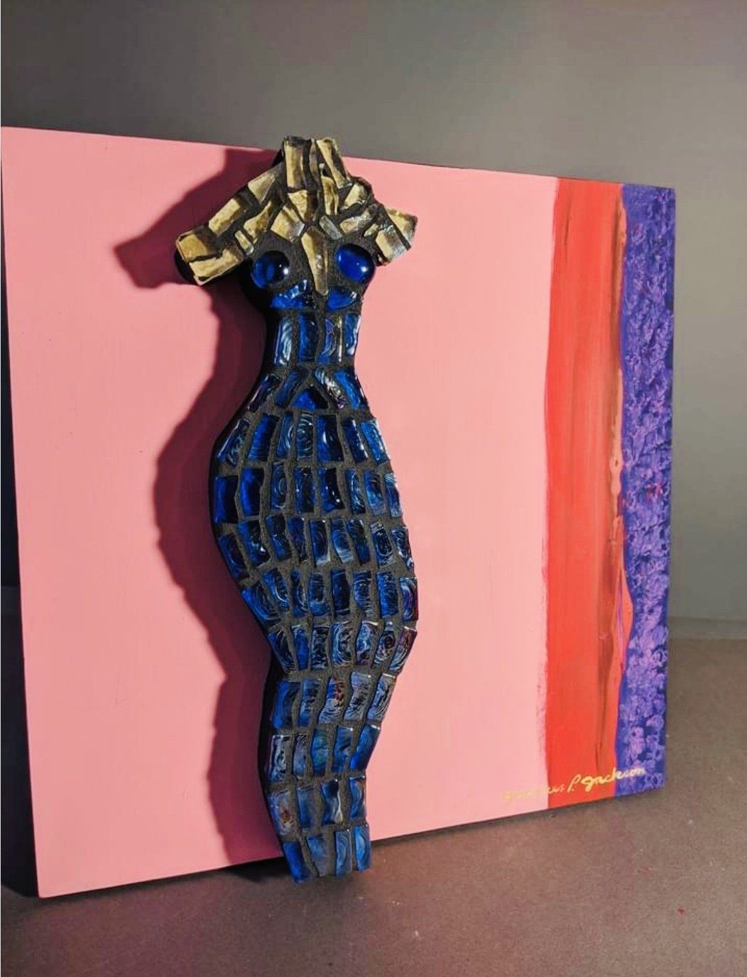 "Party Blue", is the creation of mosaic artist Jacques P. Jackson of Cleveland, Ohio. Jackson is the owner of Soul House Decor where he creates home décor pieces, plaques, wearable art, tikis, earrings, lapel pins and bracelets. We celebrate him and his work and are happy to have it here in the Art For Charity Gallery.