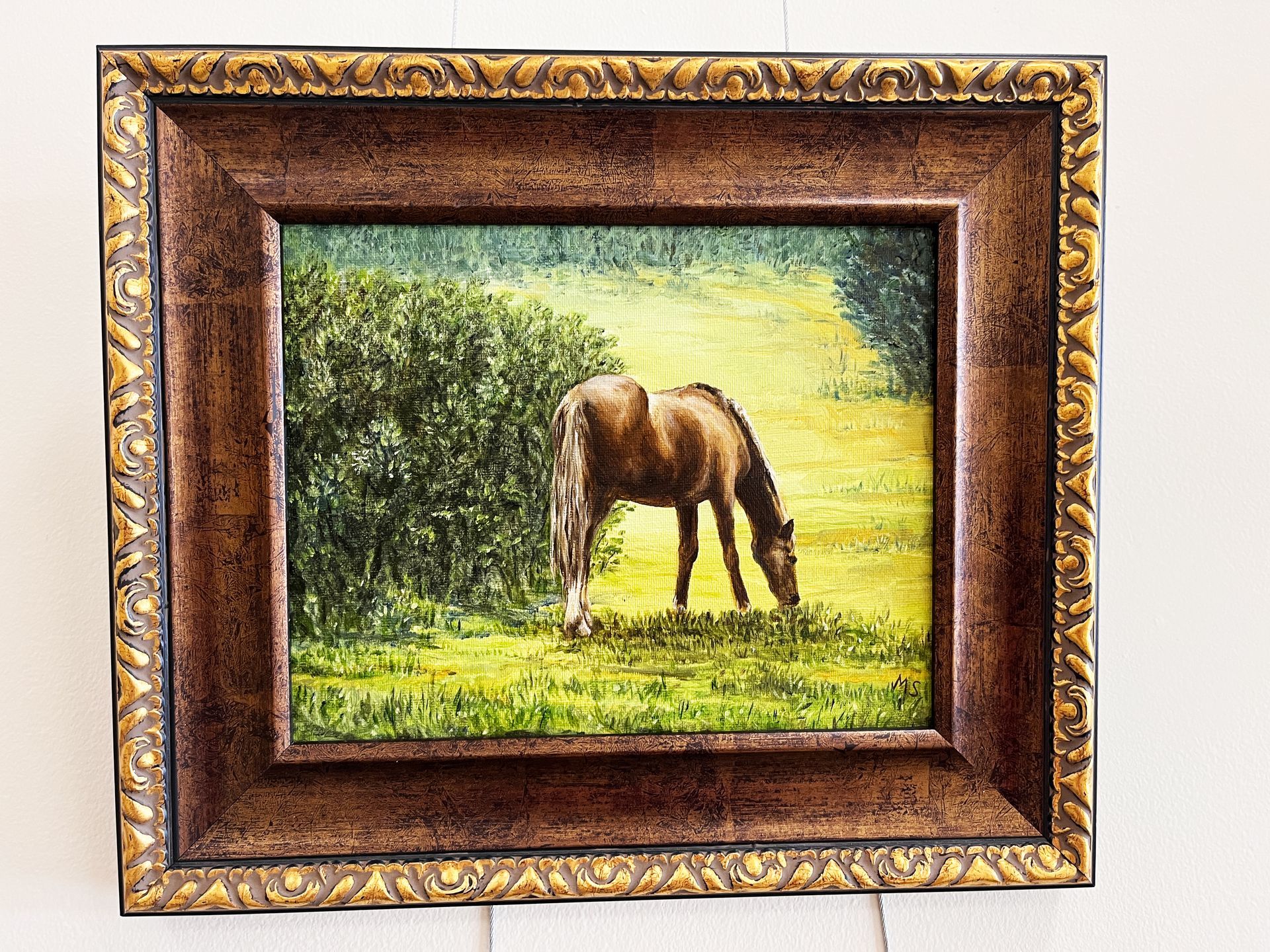 Free To Graze is an oil on canvas creation by Maureen Shallcross. Shallcross is a landscape artist from England who now resides in East Texas. She has devoted her spare time to painting landscapes, animals and birds by using only oils. We celebrate her work and are happy to have it here in The Art For Charity Gallery. This painting is 10"x8" framed. The minimum donation is $300.00.